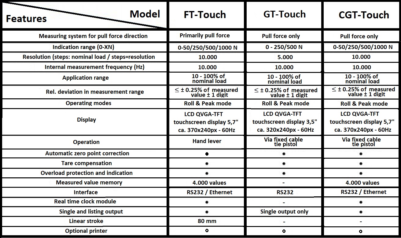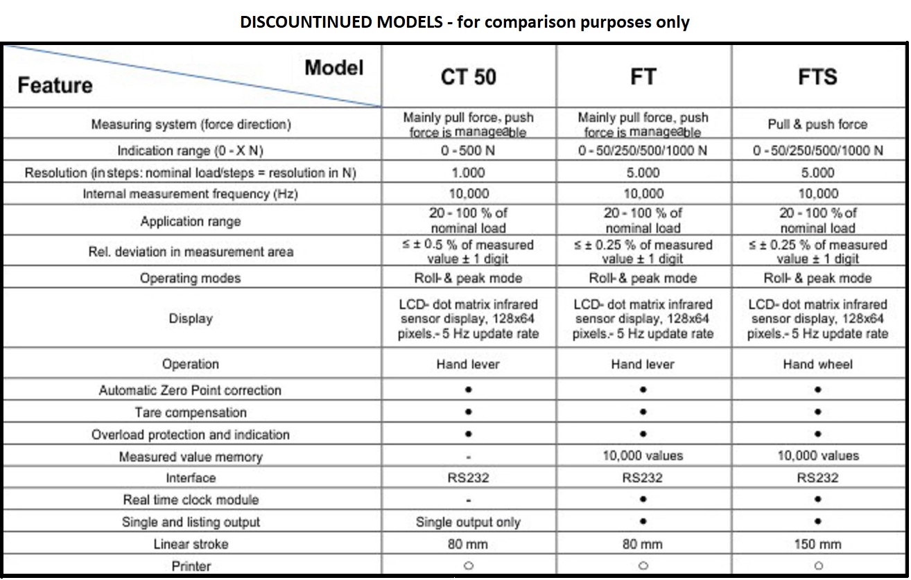 (Since the KMG is not a manually operated tester in the proper sense, it is not listed in the table below.)