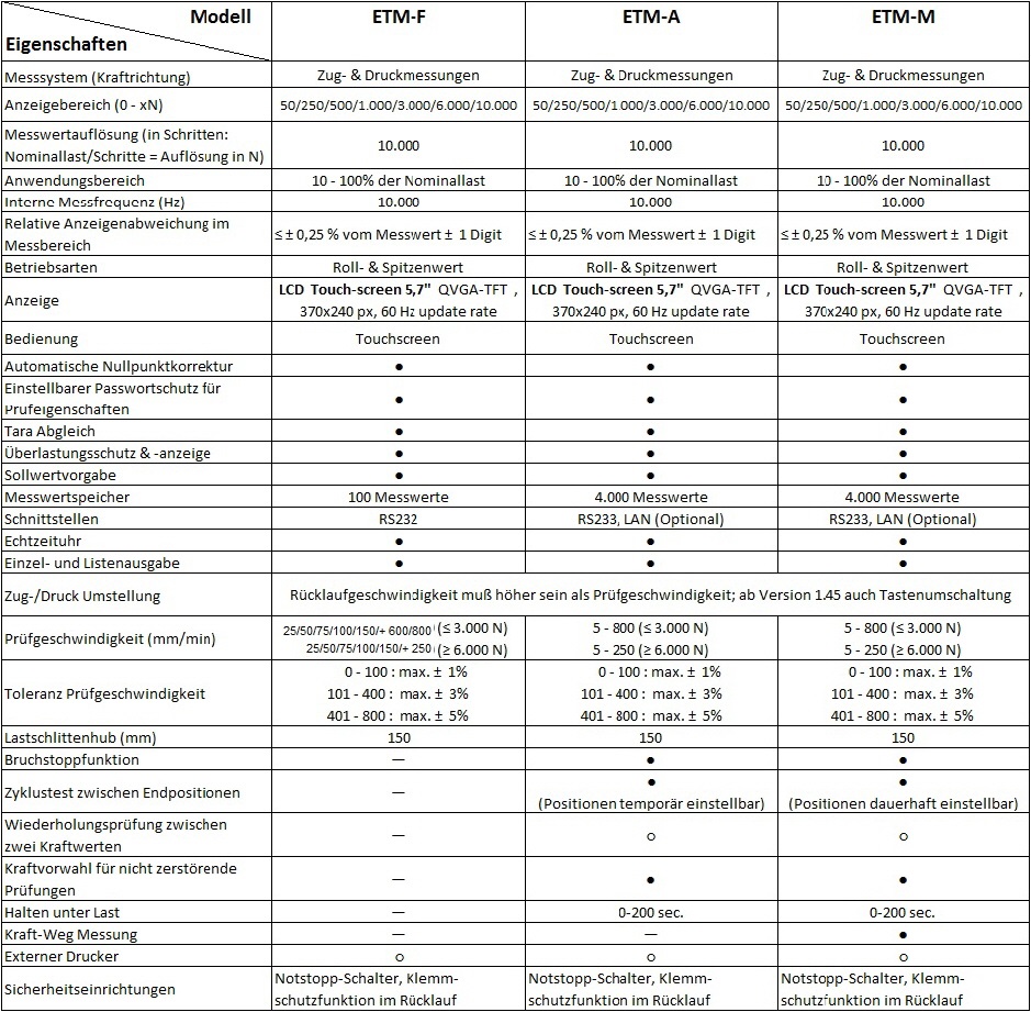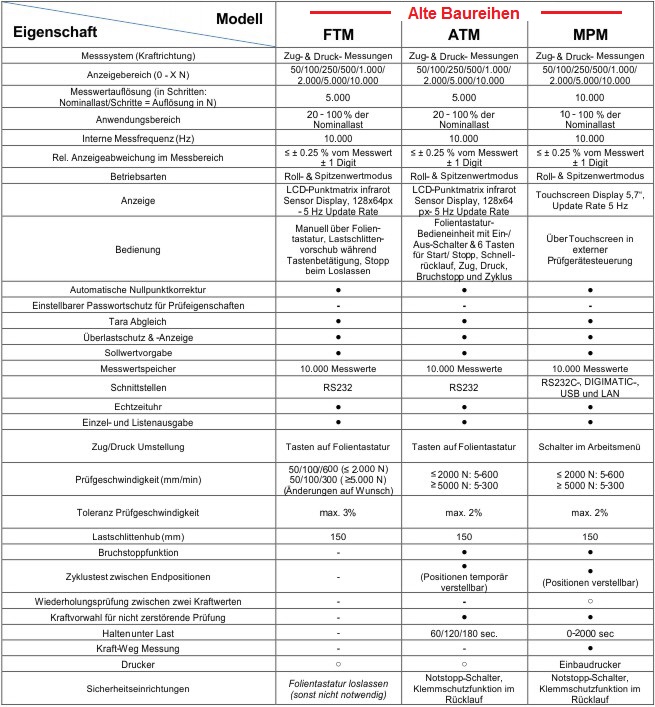 (MPM/ATM/FTM sind in der Übersicht des Vergleichs halber aufgeführt, wird jedoch nicht mehr hergestellt; Die ETM-Serie sind die Nachfolgemodelle)